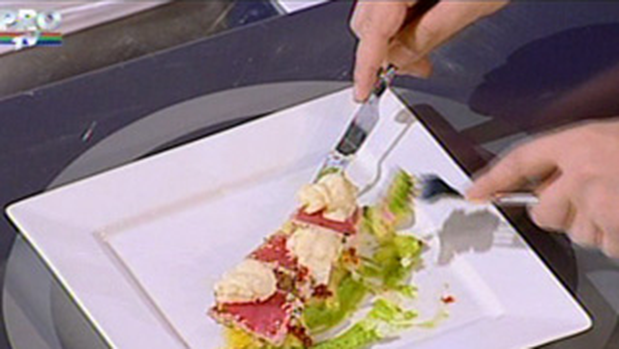 In ultima proba, Mimi a gatit carpaccio de pere si ananas, piure de mazare, homar cu sos de smantana si lamaie, ton in crusta de ierburi.