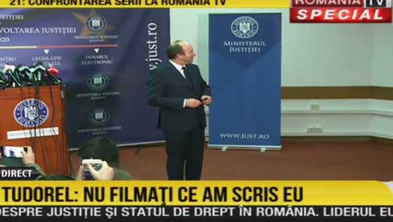 ”Haideți să și discutăm, nu numai să citim de pe raport. Despre ce comunicat e vorba, vă rog să ne explicați…” a fost rugat ministrul. ”Am spus că prezint un raport, are 36 de pagini și nu am ajuns decât la 11, dar nu răspund la întrebări. Îl veți citi, comenta, și după aceea eventual voi ține o conferință de presă și îl voi explica!” a mai spus Tudorel Toader.