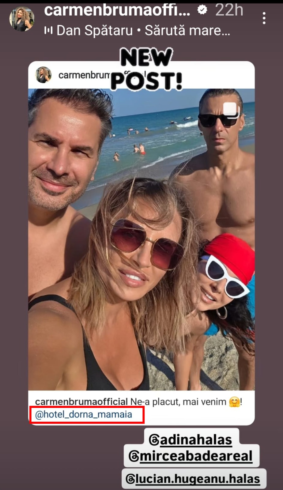 Mircea Badea (51 ani), soția lui, Carmen Brumă (48 ani), dar și prietenii de familie, Adina Halas (45 ani) & soțul, și-au rezervat ultimul weekend de vară la ”Dorna”, în Mamaia. Și le-a plăcut (😂), dacă este să o credem pe cuvânt pe doamna Badea-Brumă. Care a postat ”Ne-a plăcut, mai venim” și link spre hotelul cu pricina. Că, deh, și gazdele par să fi fost amabile cu masa, cazarea și accesul la piscină.
