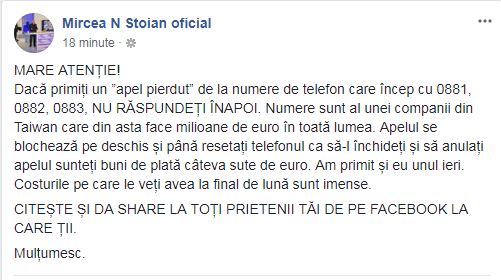 Dacă primiți un ”apel pierdut” de la numere de telefon care încep cu 0881, 0882, 0883, NU RĂSPUNDEȚI ÎNAPOI. Numere sunt al unei companii din Taiwan care din asta face milioane de euro în toată lumea. Apelul se blochează pe deschis și până resetați telefonul ca să-l închideți și să anulați apelul sunteți buni de plată câteva sute de euro. Am primit și eu unul ieri. Costurile pe care le veți avea la final de lună sunt imense.