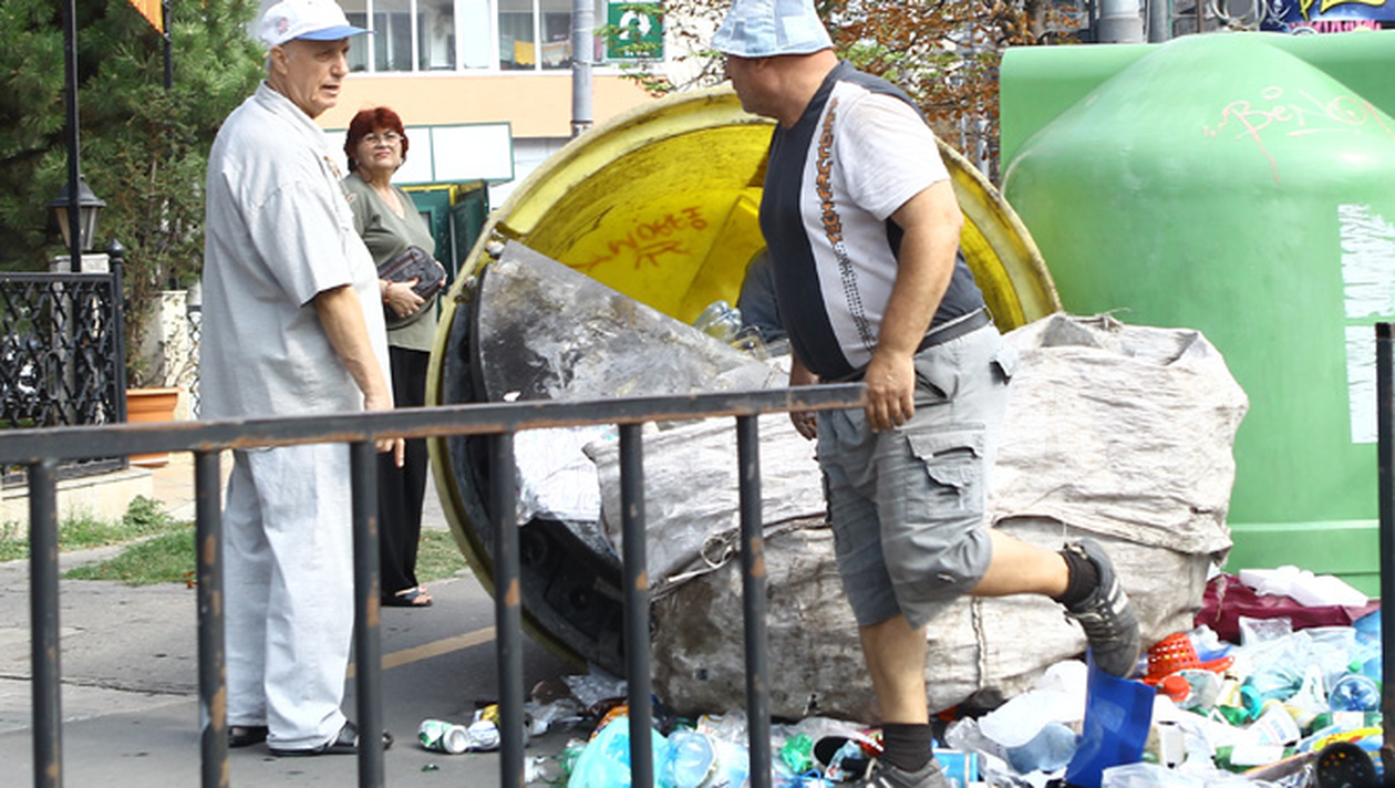 Nu este nevoie de multa munca pentru a face bani in Bucuresti, ci doar de inventivitate si un pic de curaj. Fotoreporterii CANCAN.ro au suprpins trei persoane, printre care si un minor, care rasturnau tomberoanele de gunoi clopot pentru a aduna sticlele de tip PET in vederea valorificarii lor, iar apoi strangeau gunoiul si faceau curat la locul de munca.