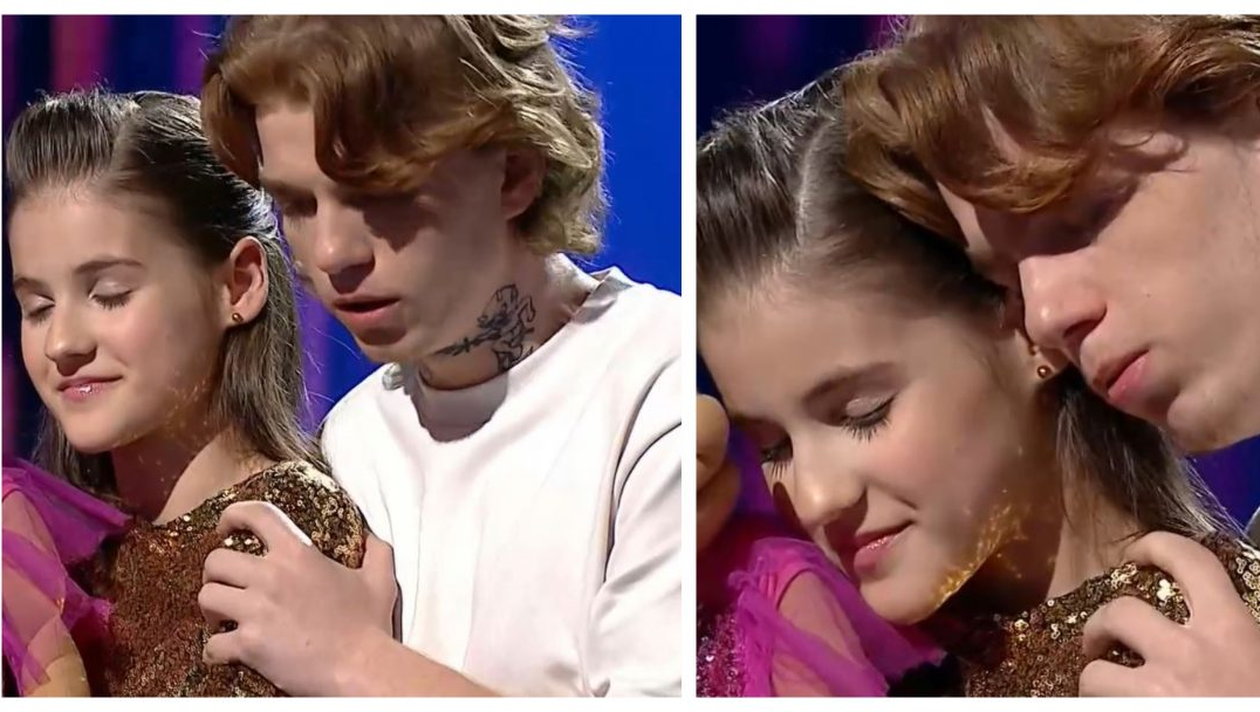 Așa cum se vede și în imagini, GIM este foarte emoționat și practic, stă sprijinit de Ana Maria Mărgean, fetița-minune de doar 11 ani, care s-a impus în finală.
