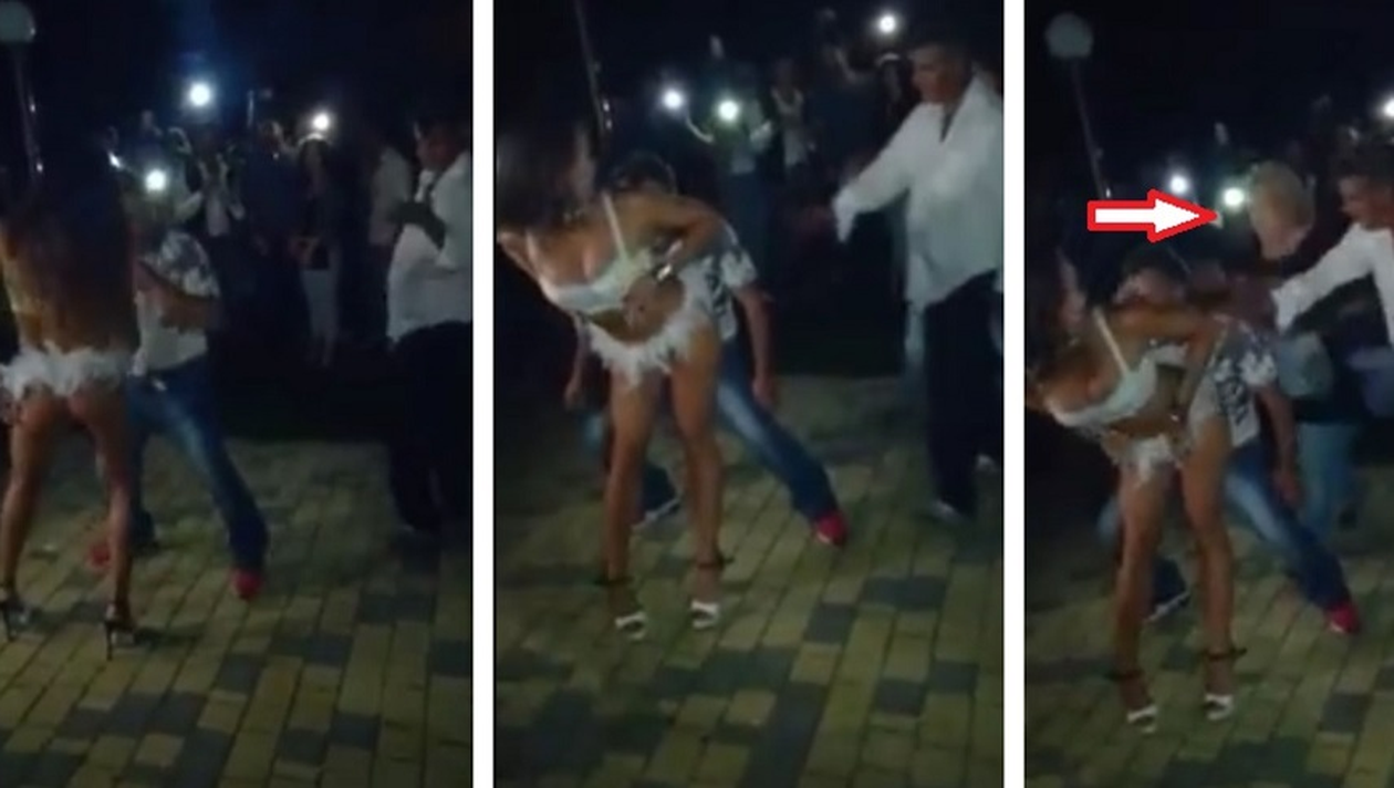 Îmbrăcată într-un costum de dans cu pene, artista a oferit un show de zile mari spectatorilor. Amețit de aburii alcoolului, un bărbat i se alătură pe ringul de dans. E un pic stângaci la început, însă, învață repede și… chiar vrea să-i arate dansatoarei mișcările pe care “le-a furat” chiar de la ea. În timpul coregrafiei apare soția noului partener de dans al brunetei. Blonda i-a foc imediat și începe “o ploaie” de palme pe spatele soțului ei. Scenele s-au petrecut sub privirile a zeci de oameni, care s-au amuzat de pățania bărbatului.