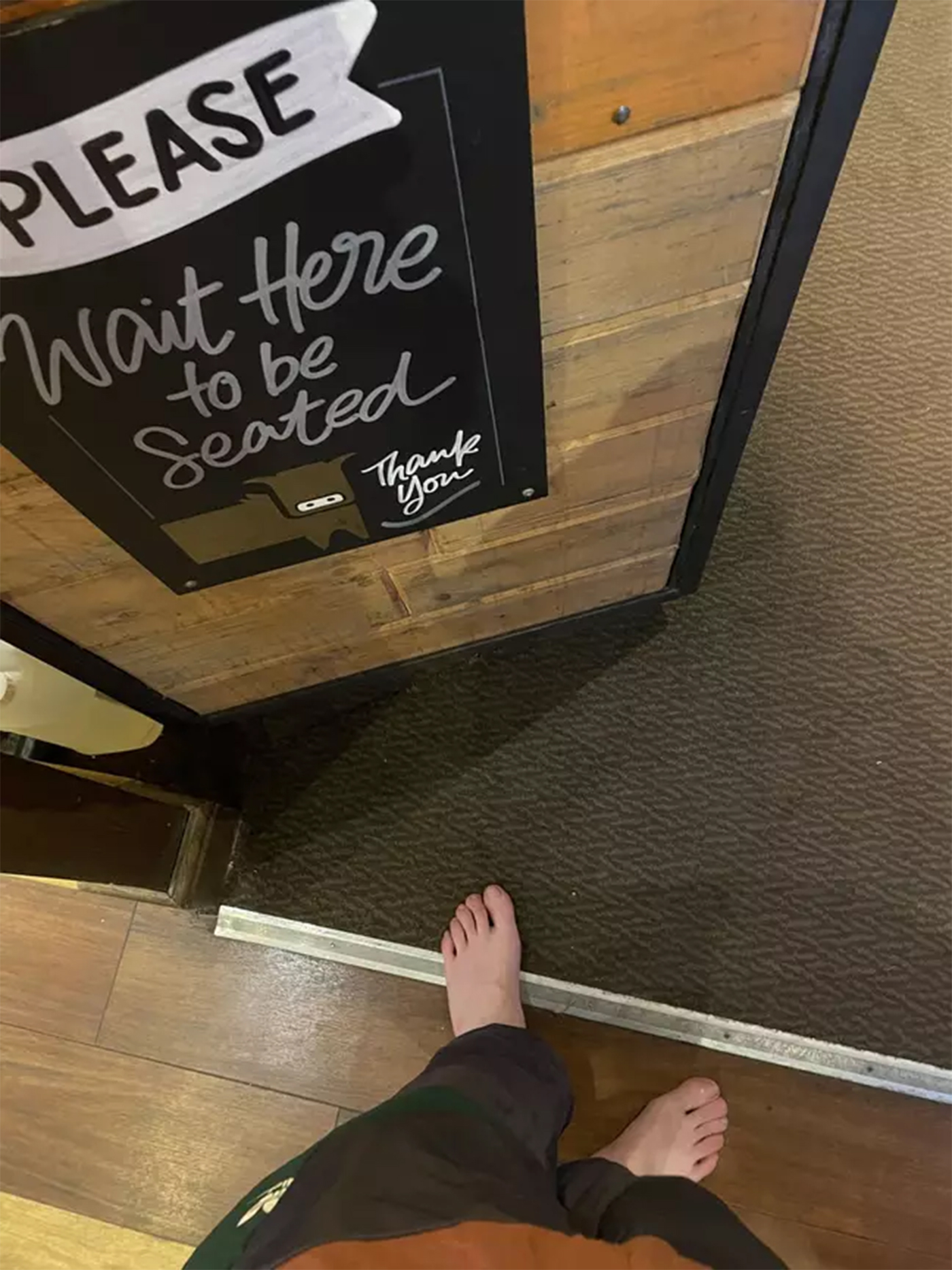 Primul chelner pe care l-a întâlnit în restaurant nu a avut nicio problemă cu acest lucru și l-a condus la masa lui. Însă, atunci când tânărul s-a ridicat să ia o sticlă de apă a fost zărit de un alt angajat, care l-a apostrofat imediat. Acesta l-a rugat să meargă să își pună pantofi în picioare, în caz contra neavând voie să servească masa în restaurant.