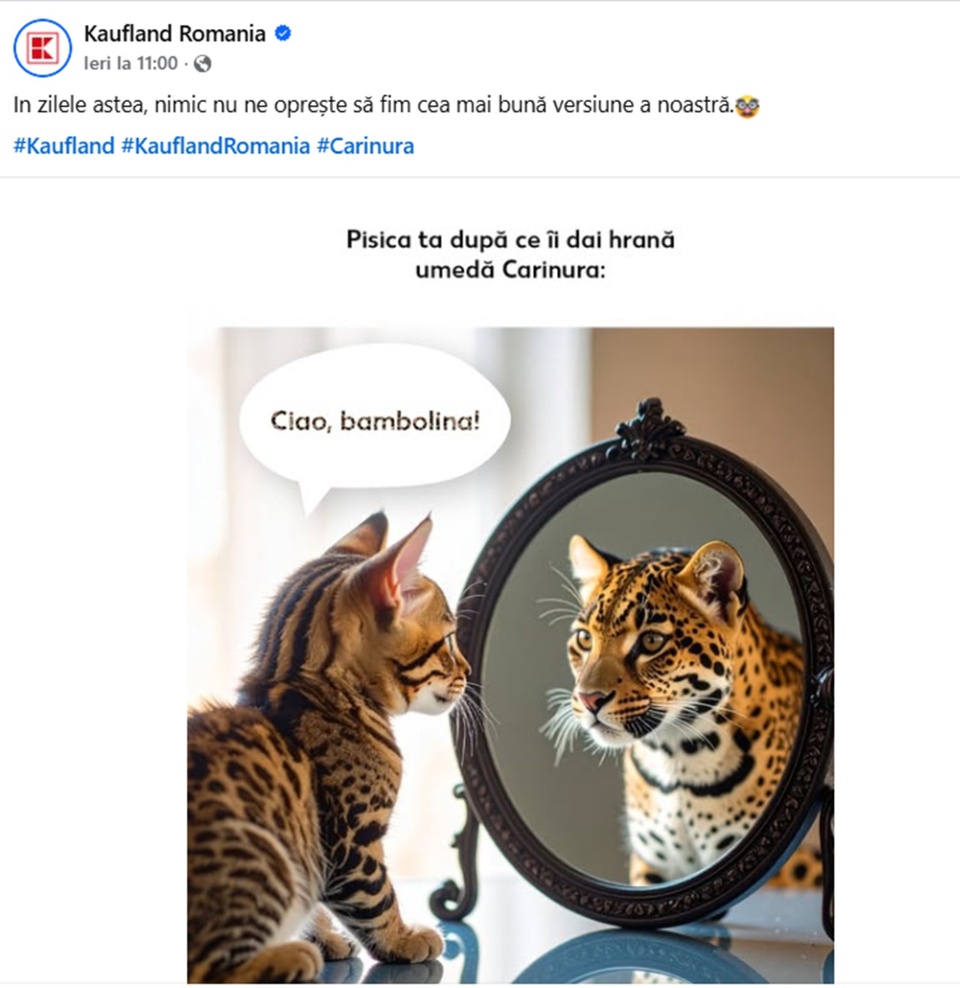 În imaginea distribuită pe pagina oficială a retailerului, vedem o pisică domestică privind în oglindă și descoperind în reflexie… un jaguar impunător. Textul de deasupra imaginii spune: „Pisica ta după ce îi dai hrană umedă Carinura”, iar în balonul de dialog, felina se admiră spunând: „Ciao, bambolina!”, o replică savuroasă care a stârnit hohote de râs și… numeroase asocieri.