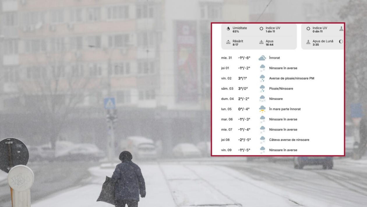 Meteorologii Weather.com au anunțat prognoza meteo pentru următoarele zile. Încă din 31 decembrie, temperaturile vor scădea până la -6 grade în timpul nopții, iar cerul va fi înnorat. Există șanse de ninsoare, iar în prima zi a anului vor fi averse de ploaie și zăpadă.