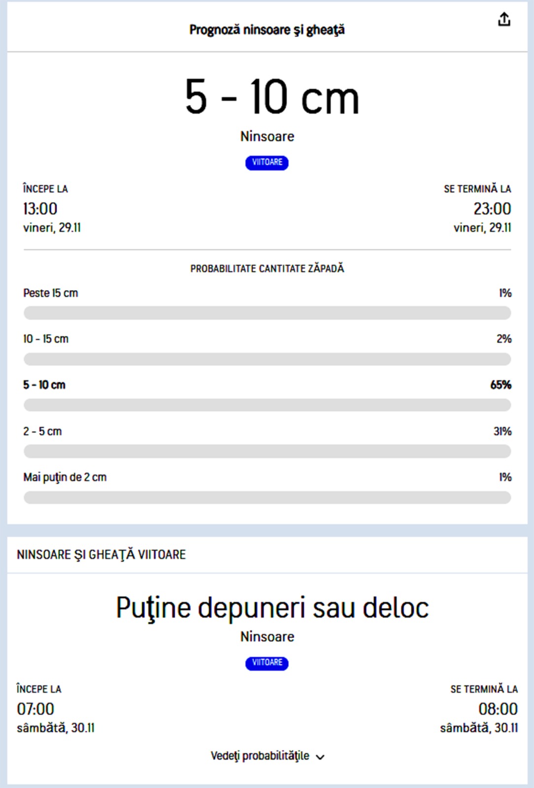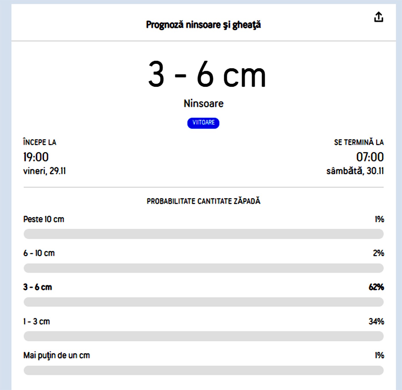 „În perioada 25 – 28 noiembrie în toată zona de munte vremea se va încălzi, astfel temperaturile maxime vor fi preponderent pozitive, cu o medie a acestora cuprinsă între 3 și 6 grade, iar minimele vor fi de -3…-2 grade. La final de noiembrie și în prima decadă a lunii decembrie sunt estimate valori termice diurne în general de -2…0 grade, iar cele nocturne se vor situa în marea lor majoritate între -8 și -4 grade. Probabilitatea de apariție a precipitațiilor va fi mai ridicată în intervalul 29 noiembrie – 3 decembrie”, se arată într-o informare făcută de ANM.