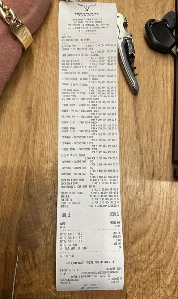 Atunci când ospătarul le-a adus nota de plată, toată lumea a rămas mască. Nu doar ei, ci și oamenii de pe internet care au văzut bonul fiscal. Doar bacșișul era de 3.200 de lei. Întreaga notă de plată a costat peste 16.000 de lei, sumă pe care au achitat-o cu cardul. La sfârșit, pentru că au făcut o consumație uriașă, patronii restaurantului au oferit cadou o sticlă de vin de colecție, scriu jurnaliștii de la Turda News. Sigur că, nimic nu se compară cu suma colosală pe care au plătit-o clienții, după ce au mâncat tot felul de delicatese.