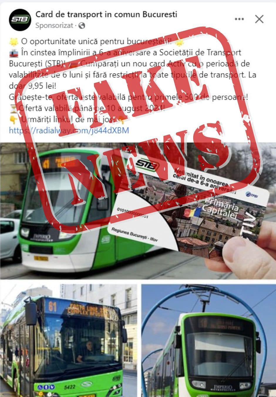O nouă înșelătorie circulă în rândul românilor! De această dată este vizată Societatea de Transport Bucureşti (STB). Reprezentanții companiei au transmis un mesaj pentru a avertiza cetățenii să nu pice în capcana escrocilor. Este vorba despre un mesaj fals postat pe rețelele de socializare în care se promovează un card cu o perioadă de valabilitate de 6 luni, fără restricții la toate tipurile de transport. Prețul este unul infim.