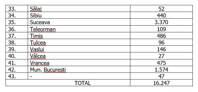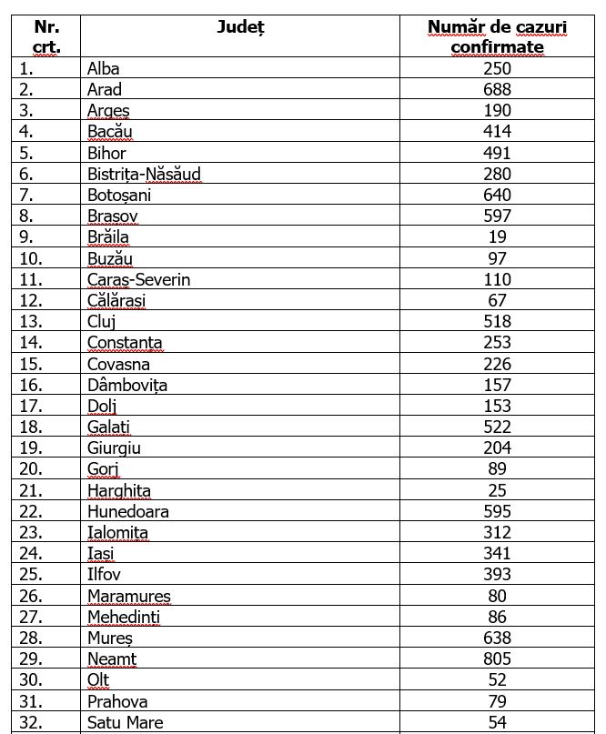 Numărul de cazuri confirmate, pe județe, potrivit raportării Institutului Național de Sănătate Publică: