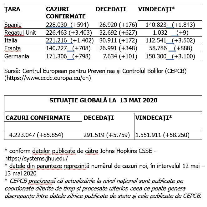 În continuare vă prezentăm situația privind infectarea cu virusul COVID – 19 (Coronavirus) la nivel european și global: