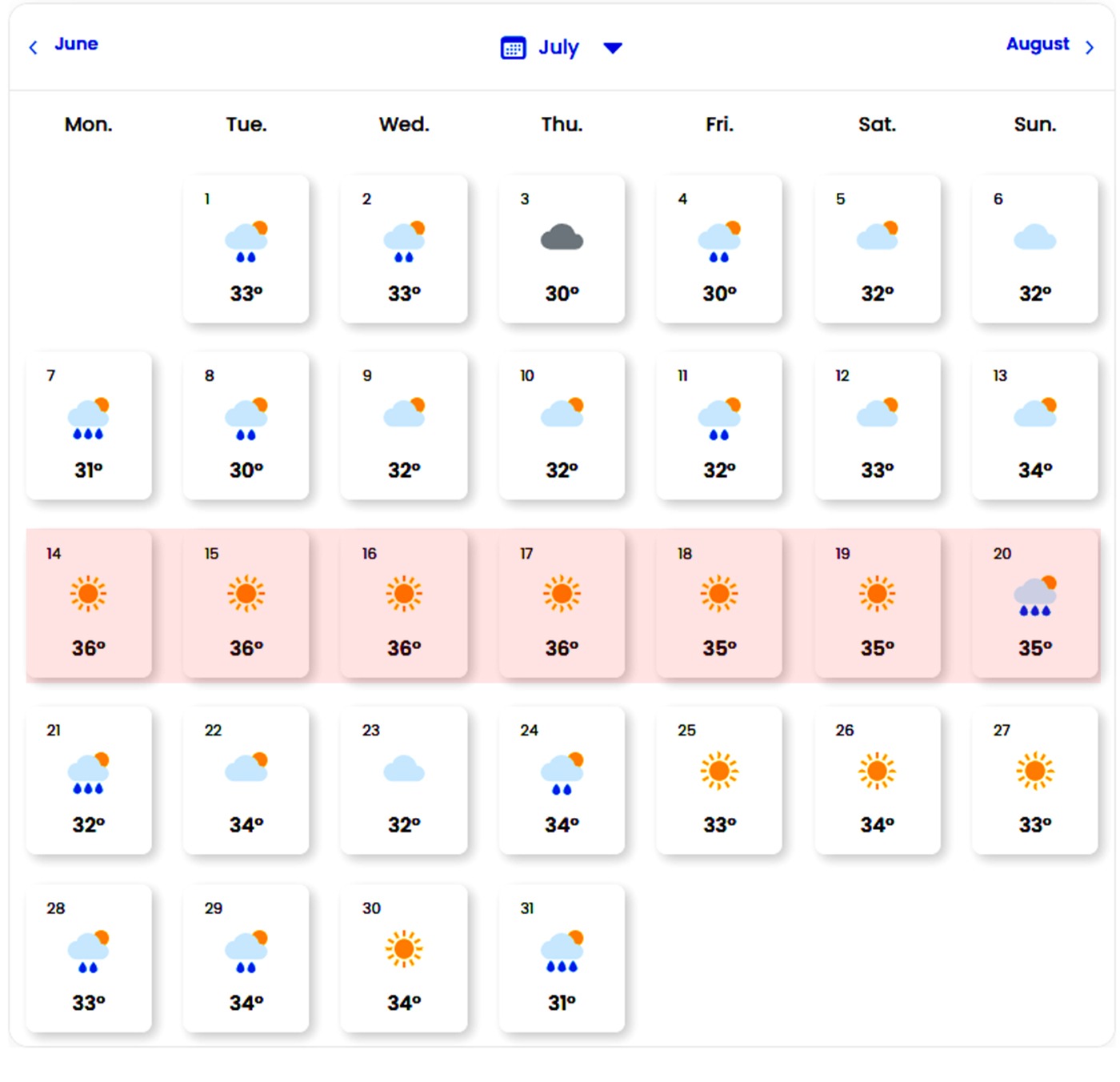 Potrivit meteorologilor, între 14 și 20 iulie, România va trece prin cea mai caniculară perioadă a verii. Temperaturile vor atinge constant 36 de grade Celsius sau chiar mai mult în unele orașe mari, precum București, Craiova, Timișoara sau Iași. Chiar și nopțile vor deveni sufocante, cu minime ce nu vor coborî sub 22 de grade Celsius.