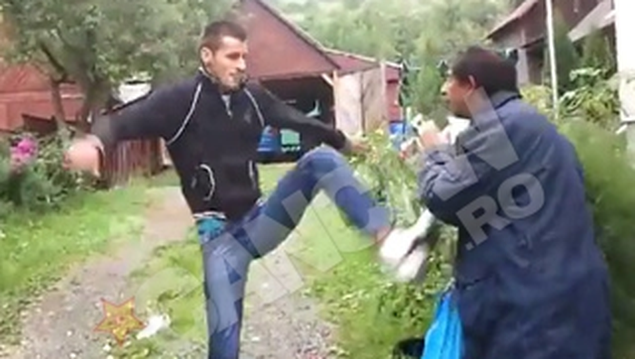 Tanarul din imagine il acuza pe barbatul de etnie rroma ca i-a furat o pereche de adidasi din curte. In tot acest timp, barbatul neaga si spune ca nu i-a furat, ci ca doar a „capatat” incaltamintea. Tanarul nu pare sa il creada, mai ales dupa ce i-a scotocit bine sacul pe care acesta il ducea in spate si in care a gasit perechea de adidasi. Asa ca incepe sa il pocneasca pe barbatul mai in varsta de etnie rroma, ii da cateva palme zdravene peste fata si incepe sa-i dea si cu picioarele in zona capului.