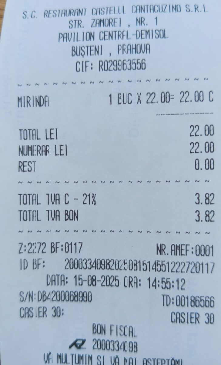 „Să mai aud eu că e nașpa la Mamaia. La Castel Cantacuzino (Bușteni) un suc de 250ml costă 22 de lei. Bine, bonul fiscal l-am obținut după niște insistențe. Mai întâi mi-au dat o hârtie fără valoare fiscală, intitulată prenotă. Hai cu pachetele! 3, 4, 5, 6…”, a spus bărbatul în postarea de pe Facebook.