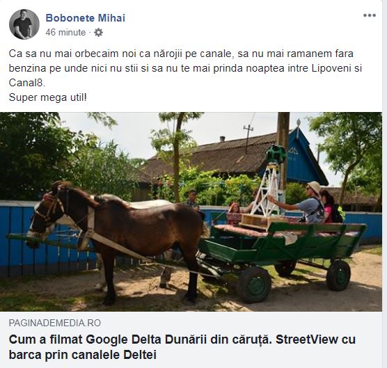 Google a filmat Delta Dunării, iar pentru asta, cei care s-au ocupat de proiect au pus camera într-o barcă pescărească, dar au folosit apoi și o căruță, pentru a lua imagini din sate. Mihai Bobonete a comentat, pe pagina lui de socializare, inițiativa Google.