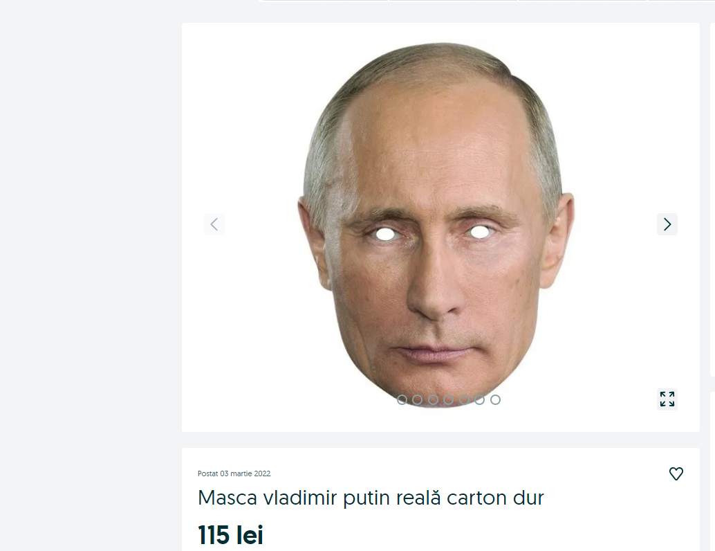 „Mască Vladimir Putin reală carton dur sigilată, originală, am mai multe modele numai pe comandă trimit. Plată în avans preţ fix. Vizionaţi şi celelalte anunțuri ale mele, super preţ.”, este unul dintre anunţurile postate pe Olx.
