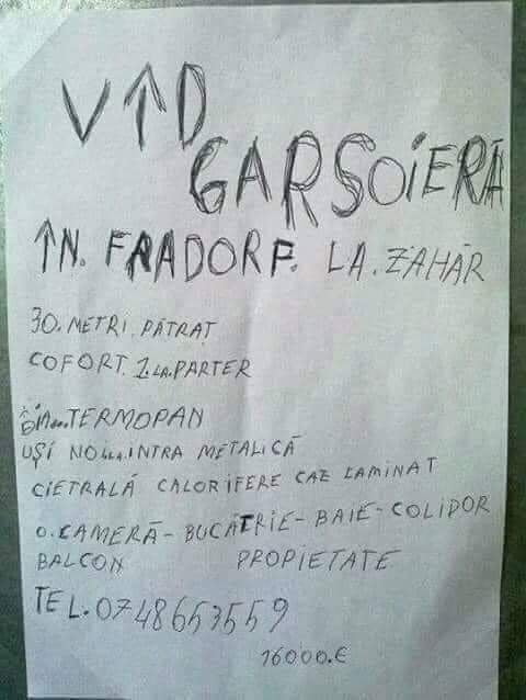 Recent, un clujean și-a dorit să vândă o garsonieră care se află în zona fabricii de zahăr, însă anunțul postat de acesta a devenit viral. Și nu pentru că garsoniera este specială sau pentru că arată impecabil, ci…. din cauza felului în care a fost scris respectivul anunț.