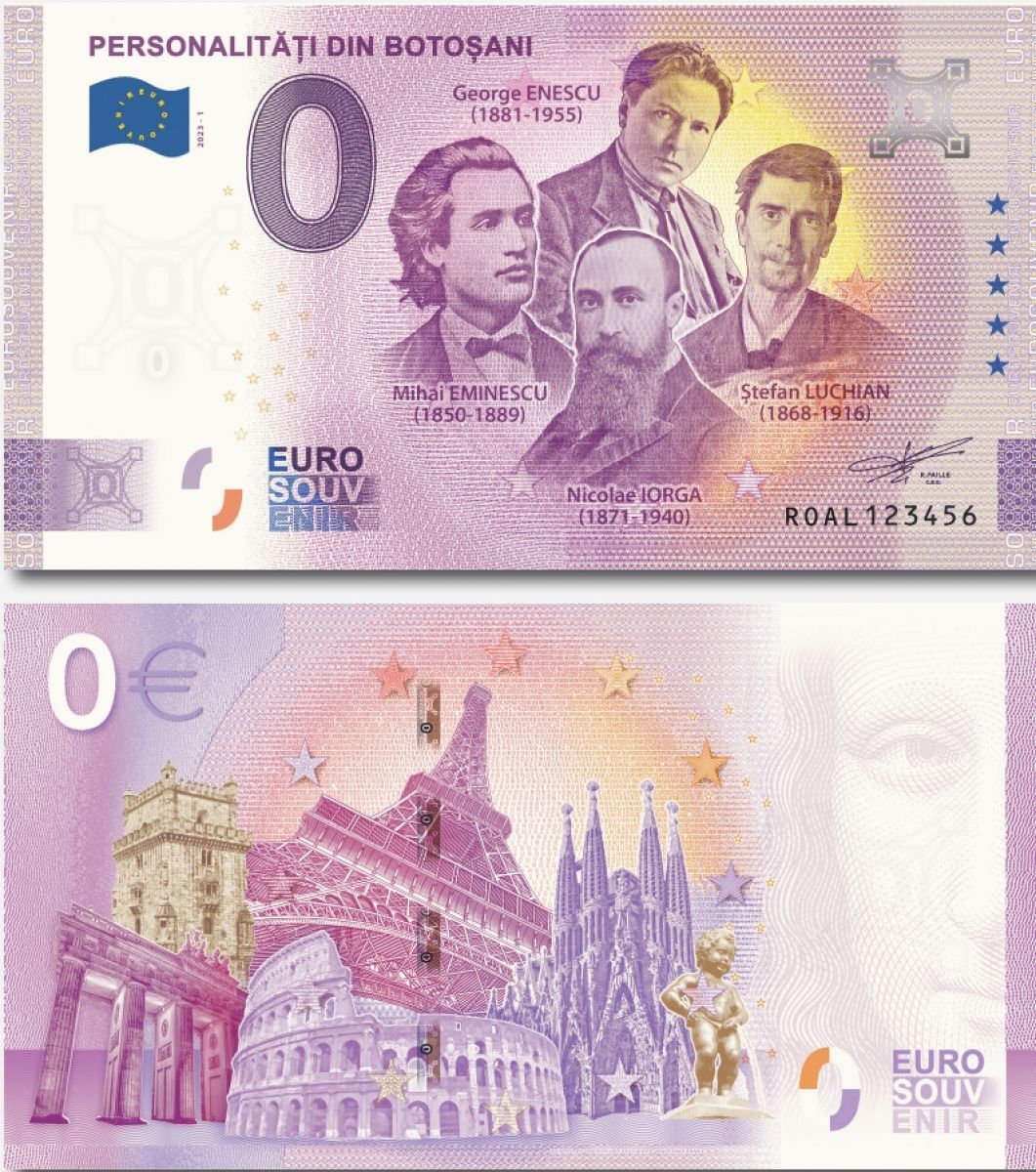 Bancnota „Personalități din Botoșani”, lansată la Muzeul Județean Botoșani, la sfârșitul lui august, s-a dovedit a fi un real succes. A fost cumpărată de colecționari de pe cinci continente. Bancnota de 0 euro a apărut într-un tiraj de 11.000 de exemplare. Aceasta a fost lansată cu scopul de care a promova brandurilor de interes național, valorile, figurile și obiectivele emblematice pentru cultura statelor membre ale Uniunii Europene. De asemenea, se omagiază astfel patru personalități definitorii pentru botoșăneni, dar și pentru istoria noastră.