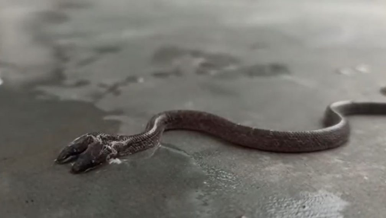 Pe filmarea de mai jos se vede cum șarpele se străduiește să-și parcurgă drumul pe podea, sub controlul a două capete care par a fi independente. Experții care au examinat șarpele spun că acesta are 14 cm lungime, două capete complet formate, cu patru ochi și două limbi “strălucitoare”. Ambele capete sunt independente, acest lucru fiind o provocare pentru ca astfel de creaturi să supraviețuiască în sălbăticie.