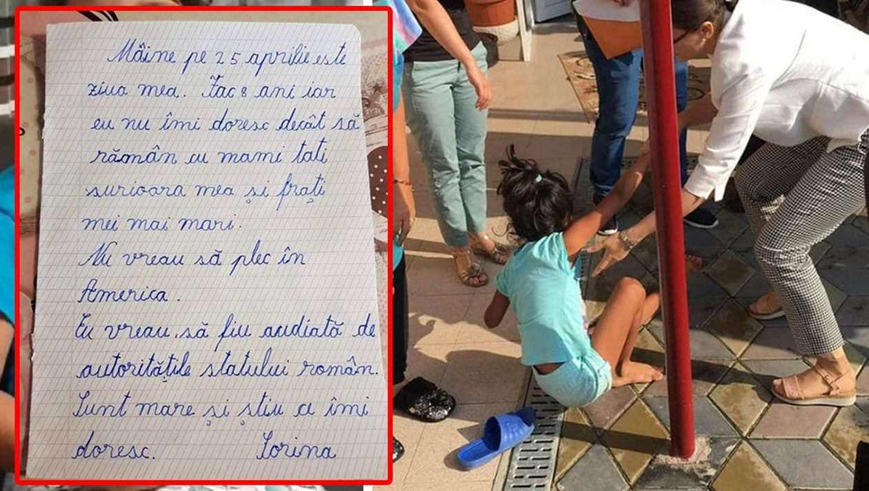 “Mâine, pe 25 aprilie, este ziua mea. Fac opt ani, iar eu nu îmi doresc decât să rămân cu mami, tati, surioara mea și frații mei mai mari. Nu vreau să plec în America. Eu vreau să fiu audiată de autoritățile statului român. Sunt mare și știu ce îmi doresc” este scrisoarea scrisă de fetița luată cu mascații dintr-o casă din Baia de Aramă.