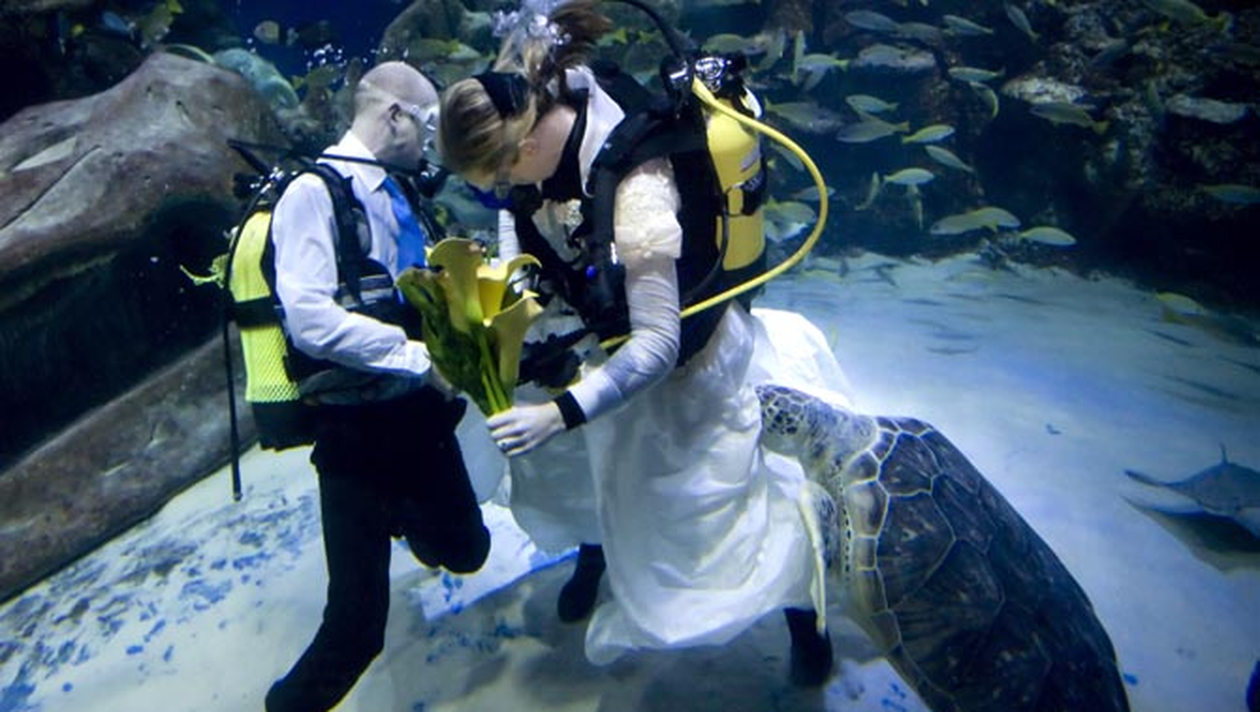 Britanicul James Oliver si aleasa sa, Kathryn O'Connor, au tinut sa aiba o nunta mai putin obisnuita, motiv pentru care cei doi au hotarat sa organizeze o ceremonie subacvatica, la acvariul Sea Life din Londra.