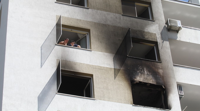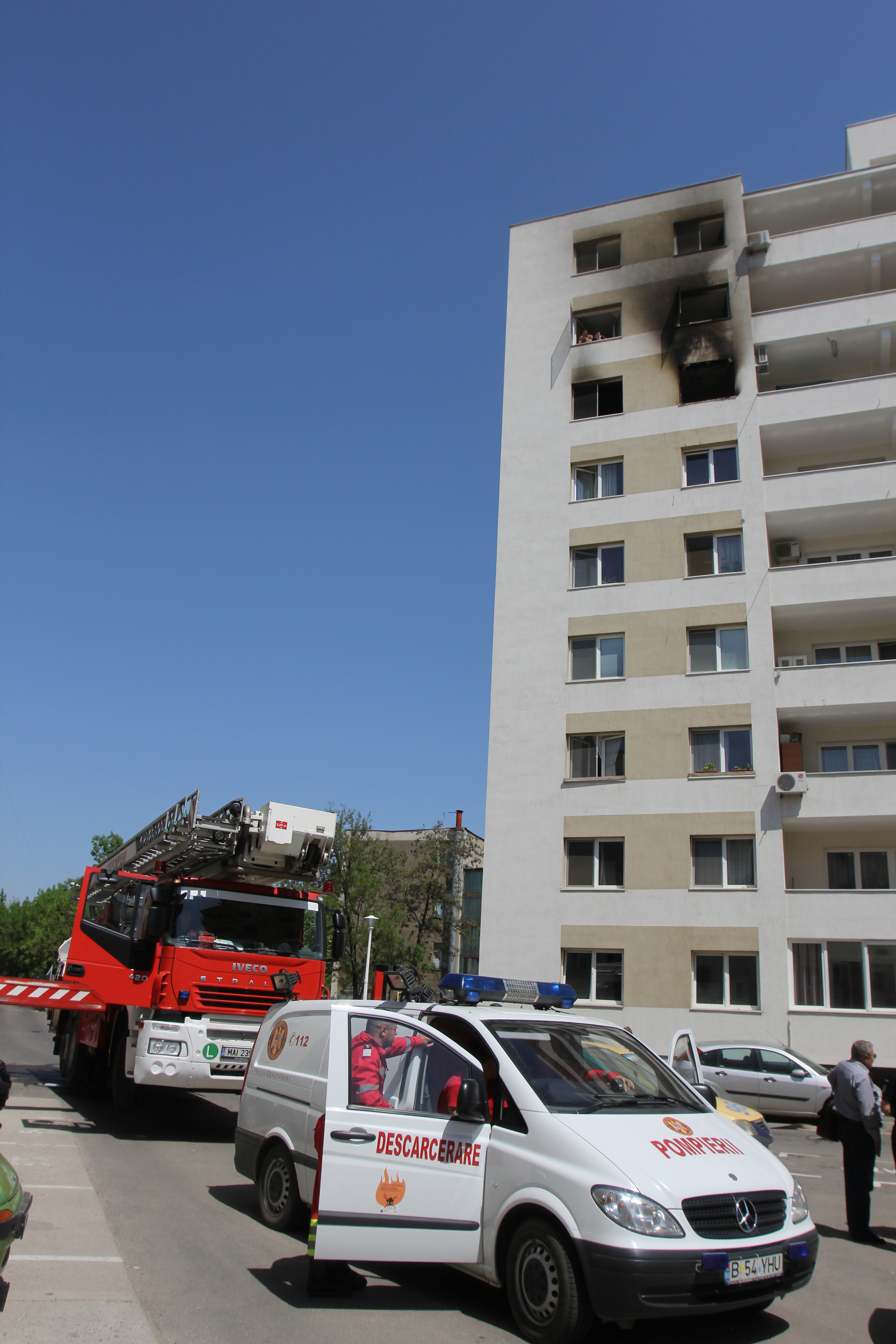 Potrivit administratorului imobilului focul ar fi pronit de la un scut circuit in spatele frigiderului, iar de aici s-a extins imediat. Au fost afectat etajul sapte si opt al imobilului, precum si o masina parcata chiar sub geamul casei care a fost curpinsa de flacari. Rama geamului de termopan de la apartament a cazut peste luneta masinii.