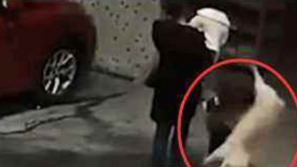 Imaginile arată cum un câine a picat pur și simplu în capul unei femei ghinioniste care se apropia de scara unui bloc. Din senin, în cadru apare și câinele în picaj liber, cel mai probabil căzut de la etaj.