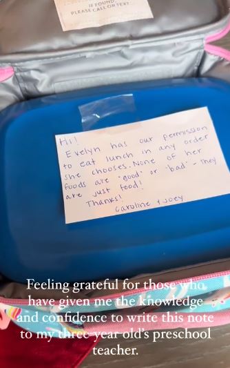 Auzind cele spuse de educatoare, mama Caroline a decis să îi transmită un mesaj acesteia. Atunci când i-a pregătit pachetul cu mâncare, a lipit un bilețel pe caserolă. Indignată de comentariul educatoarei, a decis să îi spună că fetița ei de trei ani are permisiunea să consume prânzul așa cum își dorește ea. Micuța ar fi obișnuit să mănânce, mai întâi, produsul dulce (biscuiții, prăjitura etc), apoi sendvișul. În acest sens, iată mesajul scris de Caroline pe bilețelul lipit pe caserola de mâncare.