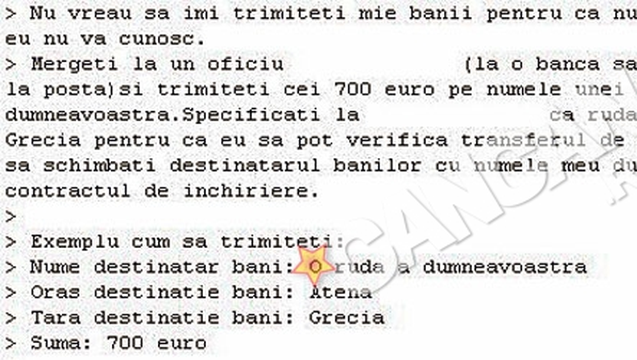 „Apartament 3 camere, Floreasca, 300 de euro, direct de la proprietar”, asa suna un anunt care la prima vedere ar reprezenta o oferta excelenta. Presupusul proprietar nu lasa insa niciun numar de telefon de contact, ci doar o adresa de e-mail. Plecand de la mai multe reclamatii facute de clienti escrocati de respectivul „proprietar”, reporterii nostri l-au contactat pe internet pe acesta. Respectivul a sustinut ca nu se afla in tara, ci in Grecia, la munca, si a solicitat un depozit in euro, pentru a fi sigur ca, pana la eventuala sa intoarcere in Romania pentru semnarea contractului de inchiriere, clientul mai este inca interesat de oferta sa.