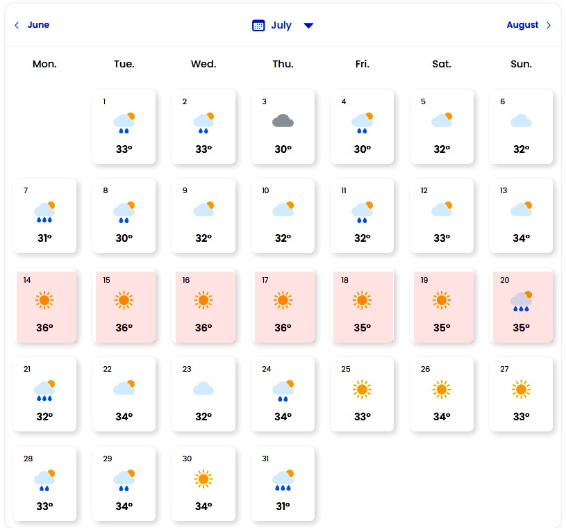 Iulie este, fără îndoială, cea mai caldă lună a verii 2025. Începând cu a doua săptămână, temperaturile depășesc frecvent pragul de 35 de grade Celsius, atingând valori de 36 grade Celsius în mai multe zile. Cele mai călduroase perioade sunt între 14 și 20 iulie, când temperaturile rămân constant ridicate. Cu toate acestea, sunt și câteva zile cu ploi izolate, în special la începutul și sfârșitul lunii.