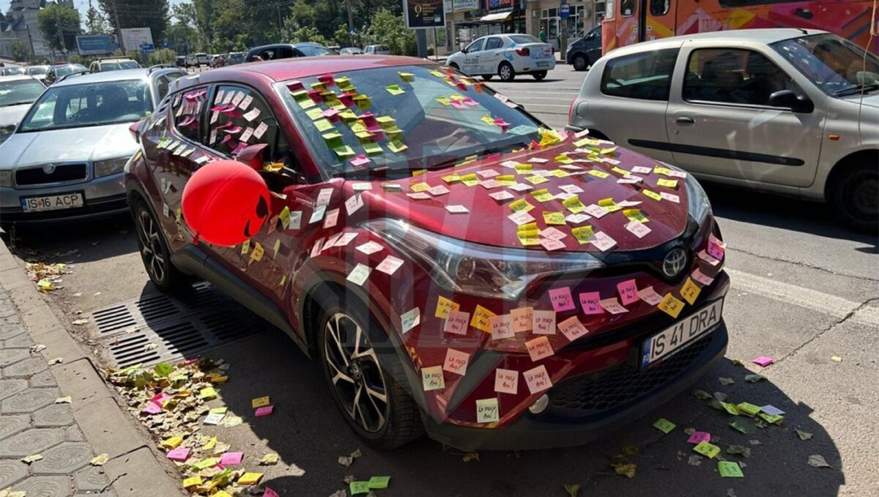 O tânără din Iași a mers în parcarea din fața blocului, acolo unde locuiește, cu intenția de a se deplasa cu autoturismul propriu. Ajunsă lângă mașină, femeia a avut parte de o mare surpriză. Aceasta a observat că vehiculul marca Toyota era plin de bilețele colorate.