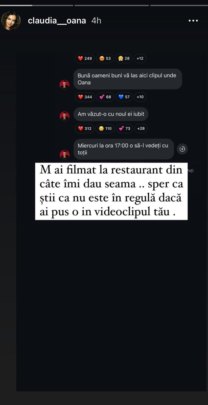 „M-ai filmat la restaurant din câte îmi dau seama… sper că știi că nu e în regulă dacă ai pus-o în videoclipul tău”, a reacționat Oana Ciocan, în mediul online.