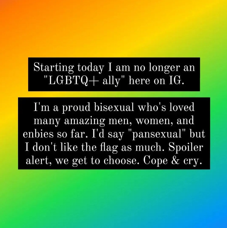 „Începând de azi nu mai sunt un «aliat LGBTQ+» aici pe Instagram. Sunt o bisexuală mândră, care a iubit mulți bărbați minunați, multe femei minunate și multe persoane non-binare minunate. Aș zice «pansexuală», dar nu-mi place steagul atât de mult. Putem să alegem. Faci față & plângi”, a scris Oana Lasconi pe Instagram.