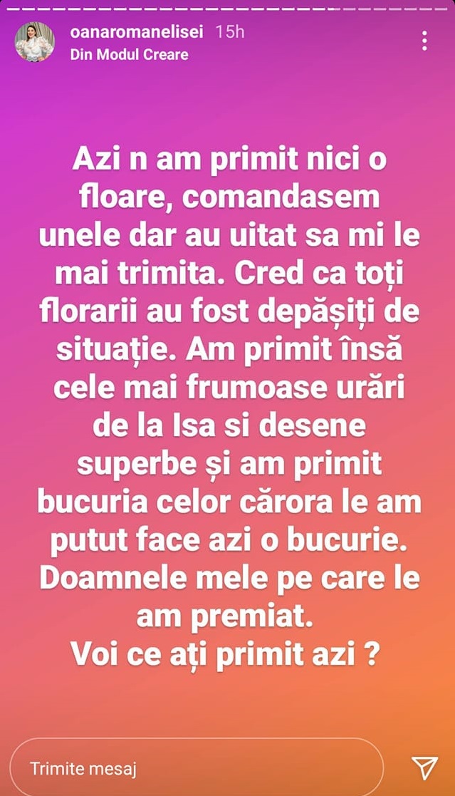 „Azi n-am primit nicio floare, comandasem unele, dar au uitat să mi le mai trimită. Cred că toți florarii au fost depășiți de situație. Am primit însă cele mai frumoase urări de la Isa și desene superbe și am rimit bucuria celor cărora le-am putut face azi o bucurie. Doamnele mele pe care le-am premiat.”, a spus Oana Roman pe InstaStory.