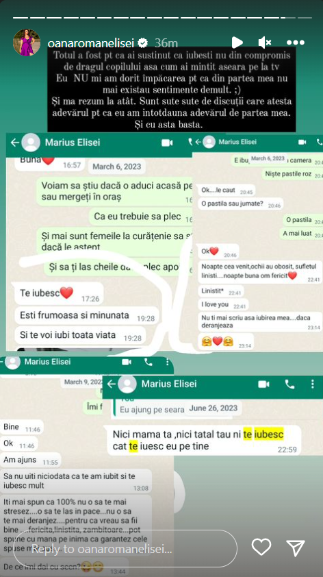 „Totul a fost pentru că ai susținut că iubești nu din compromis, de dragul copilului, așa cum ai mințit aseară pe la TV. Eu nu mi-am dorit împăcarea pentru că din partea mea nu mai existau sentimente demult. Și mă rezum la atât. Sunt sute, sute de discuții care atestă adevărul pentru că eu am întotdeauna adevărul de partea mea. Și cu asta basta”, a scris Oana Roman, pe Instagram, alături de mesajele publicate.