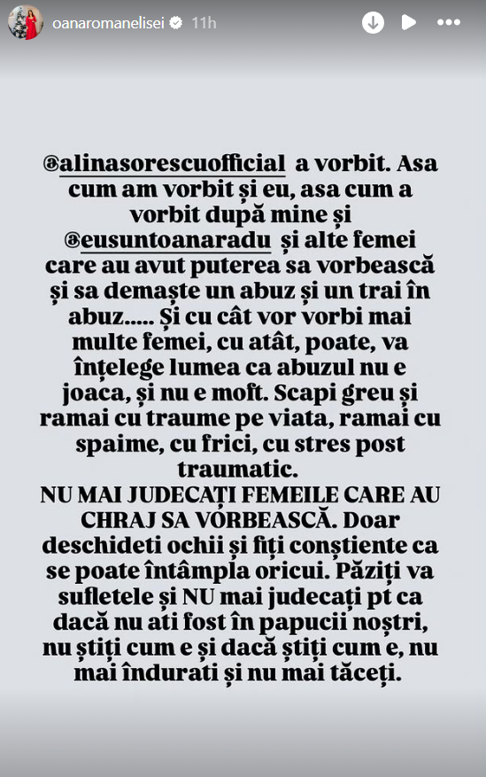 „Alina Sorescu a vorbit. Așa cum am vorbit și eu, așa cum a vorbit după mine și Oana Radu și alte femei care au avut puterea să vorbească și să demaște un abuz și un trai în abuz. Și cu cât vor vorbi mai multe femei, cu atât, poate, va înțelege lumea că abuzul nu e joacă și nu e un moft. Scapi greu și rămâi cu traume pe viață, rămâi cu spaime, cu frici, cu stres posttraumatic.”, a scris Oana Roman pe Instagram.