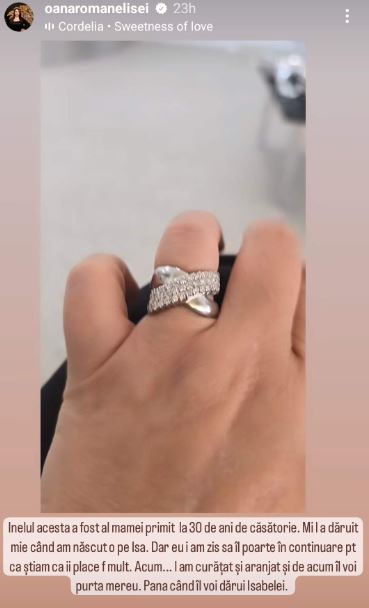 „Inelul acesta a fost al mamei primit la 30 de ani de căsătorie. Mi l-a dăruit mie când am născut-o pe Isa, dar eu i-am zis să îl poarte în continuare pentru că știam că îi place foarte mult. Acum… l-am curățat și aranjat și de acum îl voi purta mereu. Până când îl voi dărui Isabelei”, a scris Oana Roman, pe Instagram.