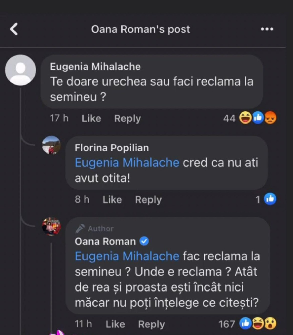 ”Fac reclamă la șemineu? Unde e reclama? Atât de rea și proastă ești încât nu poți înțelege ce citești?”, a fost replica Oanei Roman vizibil deranjată de faptul că vorbele sale sunt interpretate greșit.