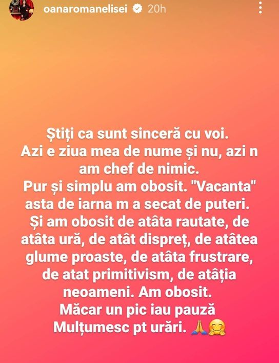 ”Știți că sunt sinceră cu voi. Azi este ziua mea de nume și nu, azi nu am chef de nimic. Pur și simplu am obosit. Vacanța asta de iarnă m-a secat de puteri. Și am obosit de atâta răutate, de atâta ură, de atât dispreț, de atâtea glume proaste, de atâta frustrare, de atât primitivism, de atâția neoameni. Am obosit! Măcar un pic iau pauză. Mulțumesc pentru urări”, a scris Oana Roman, pe pagina sa de Instagram.