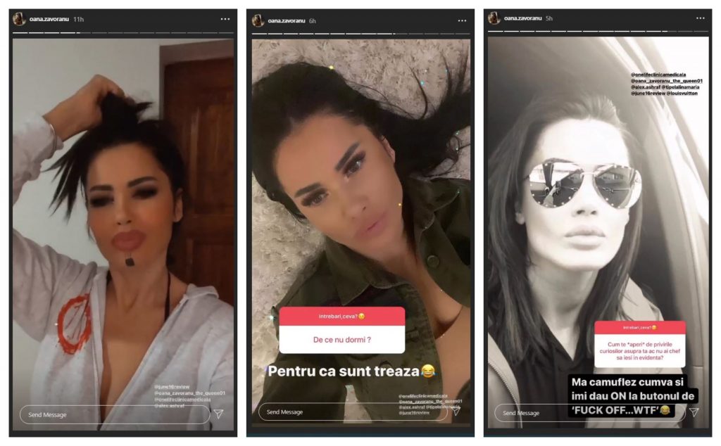 Ulterior, celebra brunetă a stat de vorbă cu fanii săi, cărora le-a răspuns la diferite curiozități – pe care le puteți descoperi în galeria foto a articolului. Unul dintre susținătorii a întrebat-o: “Cum te «aperi» de privirile curioșilor atunci când nu ai chef să ieși în evidență?”, iar Oana Zăvoranu i-a dat următoarea explicație: “Mă camuflez cumva și dau ON (n.r.: pornesc) butonul de «Fuck off… wtf» (n.r.: Valea!… ce naiba)”.