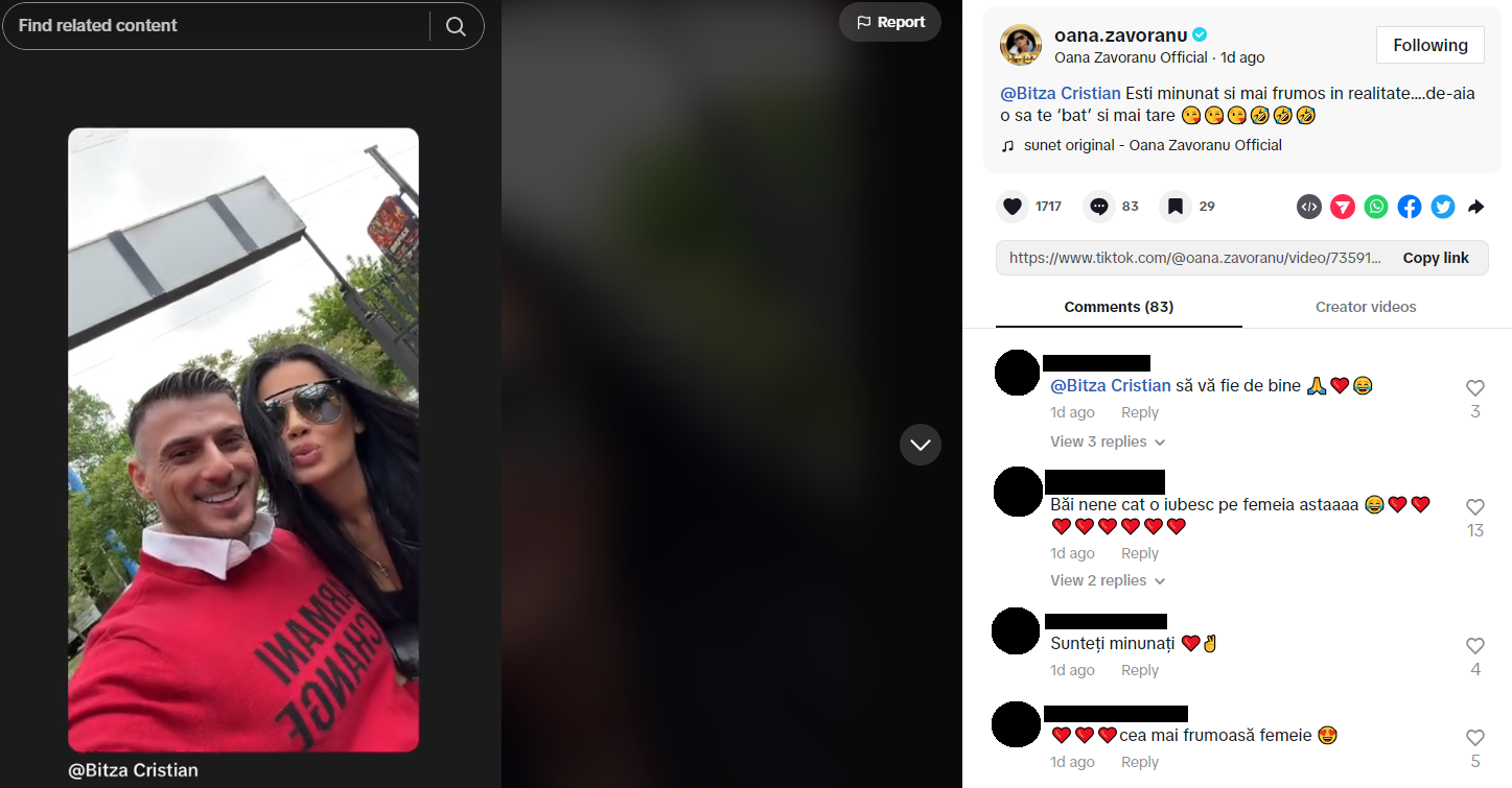 „Te iubesc mult, om frumos”, i-a scris Oana Zăvoranu la o altă postare pe Tik Tok. De altfel, și Cristian i-a răspuns: „Și eu”. De altfel, în postarea sa, bărbatul cu 16 ani mai tânăr decât „Querida” o alinta pe vedetă „Onuța mea”, semn că cei doi se cunosc de ceva timp și ar avea o legătură apropiată.