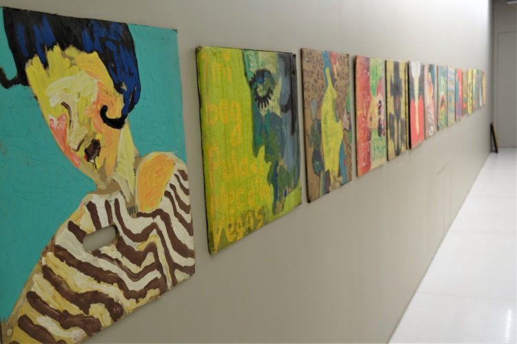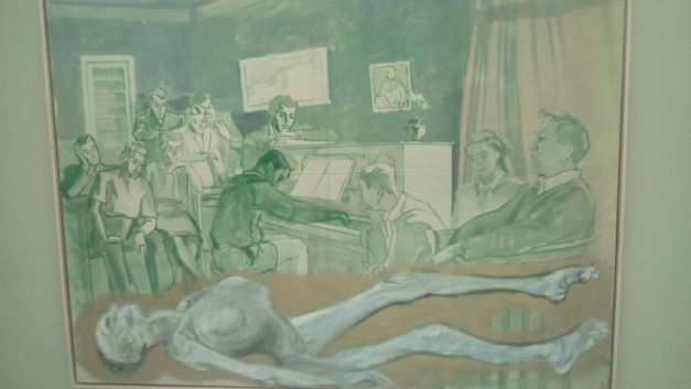 În colecția permanentă există lucrări foarte valoroase. Am menționat deja o lucrare de Pavel Ilie, Obiect, care e făcut din chirpici pe structură de sârmă și beton armat. E apoi lucrarea lui Ion Grigorescu, Cadavru împins de buldozere. Și seria de picturi a lui Nicolae Comănescu din imaginea cu holul de mai sus, care e foarte importantă pentru istoria artei românești de după 1989. Mai e apoi o pictură de Tudor Graur, Compoziție / Cărniță, 1985, ocazie rară de a-l vedea pe artist în postura de pictor. Remarcabile sunt și cele două lucrări ale lui Roman Cotoșman, Fără titlu, din 1987.