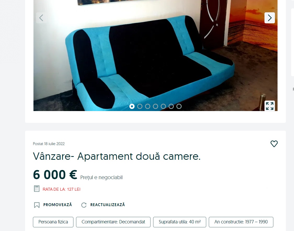 De exemplu, o altă persoană vindea, recent, un apartament cu două camere, la același preț, însă în județul Sibiu, în localitatea Agnita. Precum și proprietarul amintit mai sus, și acesta oferea spre vânzare o locuință mobilată și utilată.