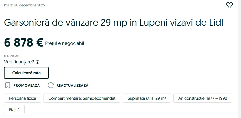 Un astfel de exemplu vine din Lupeni, oraș situat în Valea Jiului, unde o locuință de 29 de metri pătrați este scoasă la vânzare pentru doar 35.000 de lei, adică aproximativ 7.000 de euro.