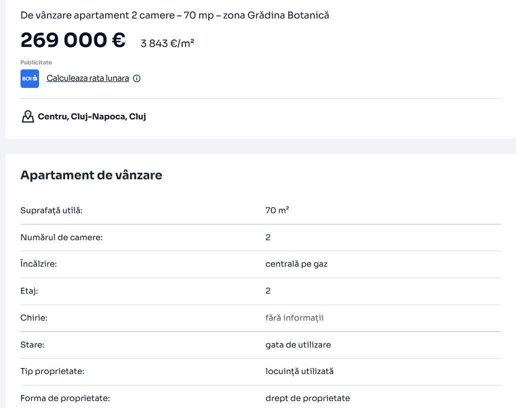 Piața imobiliară din România continuă să surprindă prin prețuri care, în anumite orașe, se apropie tot mai mult de nivelurile practicate în marile capitale europene. Un nou exemplu vine din Cluj-Napoca, oraș care își consolidează statutul de lider național în ceea ce privește costul locuințelor. Un apartament cu doar două camere, situat într-o zonă considerată premium, a ajuns să fie scos la vânzare pentru suma de 269.000 de euro.