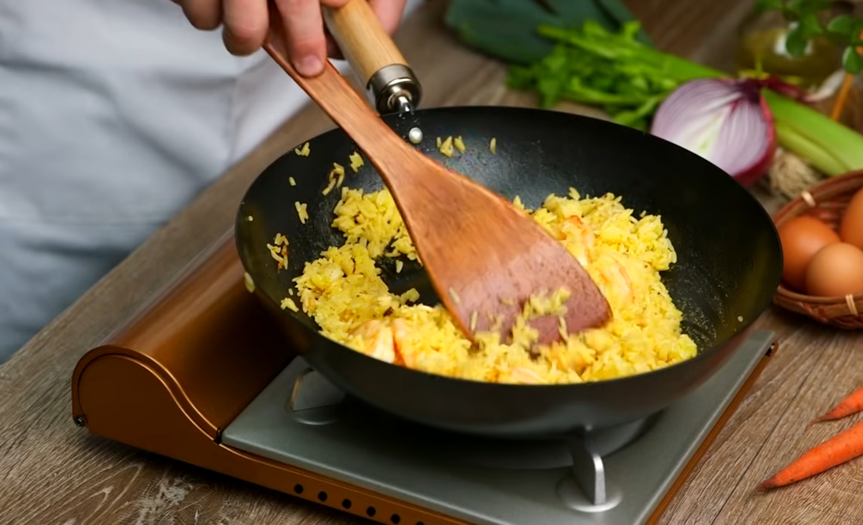 Adăugăm amestecul de orez și gălbenuș în wok, desfăcând eventualele cocoloașe cu spatula. Presăm orezul pentru a atinge bine suprafața fierbinte a tigăii, secretul gustului autentic. Incorporăm legumele tocate, piperul alb, sarea și un strop de suc de lămâie.