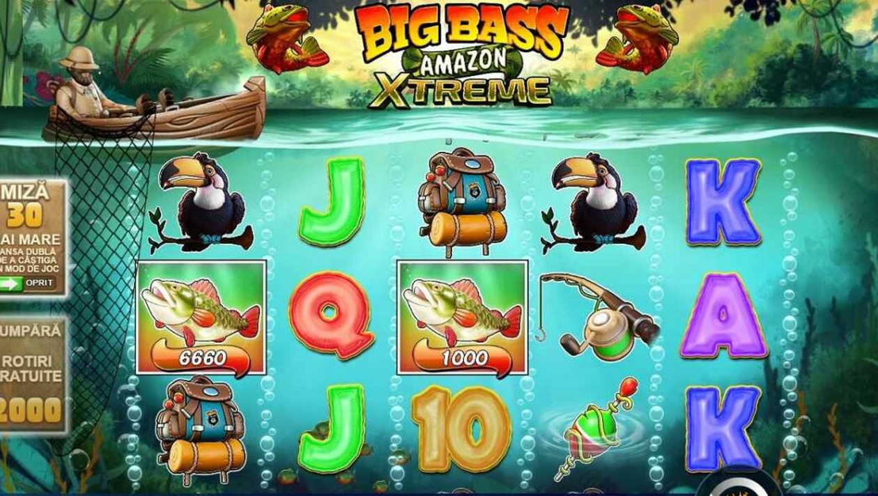 Dacă mai ai câteva zile de concediu, te invităm la o partidă de pescuit. Nu oriunde, ci pe Amazon. Știm, Dunărea era mai aproape, dar pe fluviul american este mult mai palpitant, pentru că trebuie să te ferești de crocodili, de piranha și de alte creaturi care se uită la tine și văd cina. Acest joc din seria „Big Bass” prezintă pescarul în stânga grilei, într-o barcă. Apa este traversată de pești exotici, iar pe grilă sunt simboluri precum papagalul, pluta, lanseta și rucsacul caracteristic exploratorilor.
