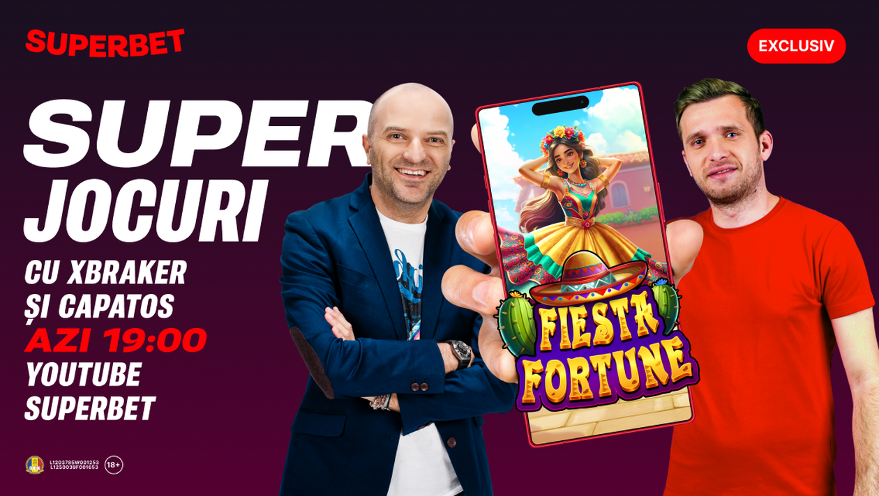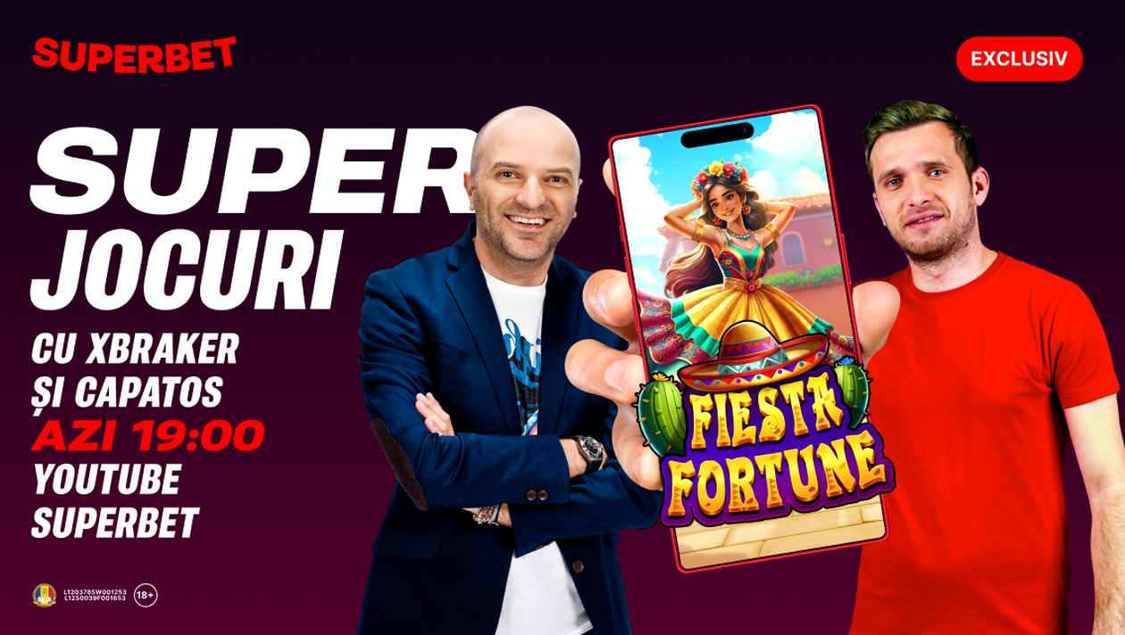 Începând cu ora 19:00, urmează SuperDistracție live, pe YouTube Superbet! Focusul episodului va fi lansarea celor de la Pragmatic Play, Fiesta Fortune, o adevărată petrecere din casinoul Superbet! Jocul este exclusiv, are un câștig maxim potențial de 5.000x miza, re-spins, rotiri gratuite și Bonus Buy. Hai în Live, cei doi responsabili cu distracția te așteaptă!