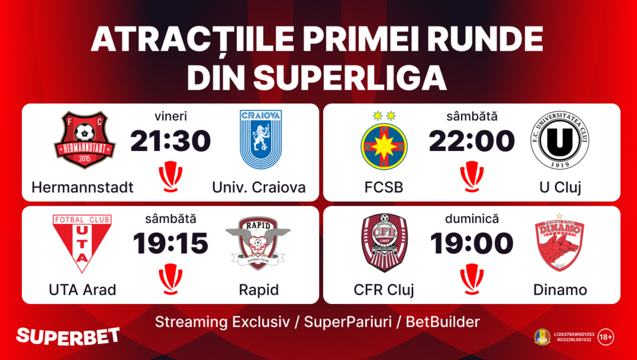 SuperLiga 2024/2024, al treilea sezon în care divizia de elită a fotbalului românesc e sponsorizată de Superbet, pleacă la drum vineri, 12 iulie 2024, după o pauză scurtă, cantonamente intense și multe dorințe care așteaptă să fie transformate în realitate. Treaba din birouri e aproape terminată, luptele se mută pe dreptunghiul verde și toată acțiunea are loc pe Superbet alături de Streaming Exclusiv, SuperPariuri, BetBuilder și Pariuri Antepost pentru o stagiune care se anunță de neuitat!