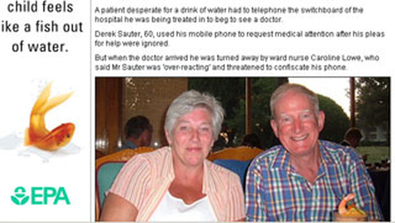 Derek Sauter, in varsta de 60 de ani, aimplorat-o pe asistenta Caroline Lowe sa ii dea un pahar cu apa, dar aceasta a fost imuna la rugamintile lui disperate si, mai mult de atat, l-a oprit pe medicul chemat de pacient prin telefon sa-l consulte si sa-i acorde ajutor. Dupa opt ore, barbatul a murit in chinuri mari. El se internase cu o banala infectie pulmonara.
